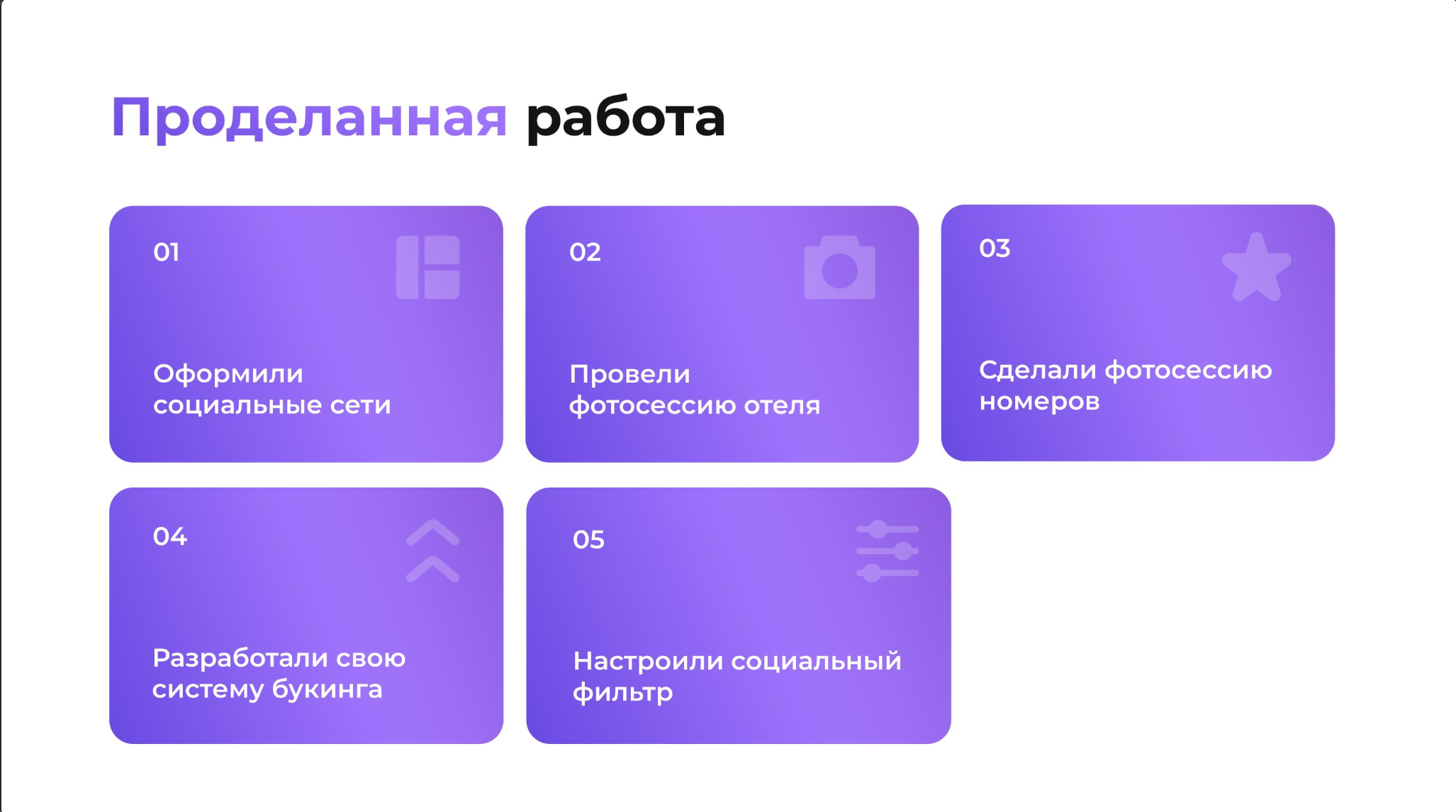 Высокая степень удовлетворенности заказчика за счет успешной реализации стратегии в социальных сетях и создания привлекательного визуального образа отеля.